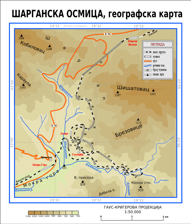 Cel mai dificil sector al proiectului de cale ferată a fost cel dintre Šargan-Vitasi şi Mokra Gora. Acesta trebuia să traverseze şi apoi să coboare din Pasul Šargan, o proeminenţă de aproximativ 300 de metri faţă de Mokra Gora. În timpul ocupaţiei austriece, s-a încercat avansarea lucrărilor de conectare a Bosniei cu Serbia. Tunelul Šargan, astăzi în lungime de 1825 de metri, s-a surpat în anul 1916 în timpul construcţiei, omorând 200 de prizonieri italieni şi ruşi. Comemorarea centenarului tragediei a avut loc în 2016. La scurt timp după alunecarea de teren, lucrările au fost suspendate. În anul 1921 s-a reluat proiectul străpungerii Muntelui Šargan, cu faimosul proiect ingineresc sârbo-bosniac al Optului de la Šargan.